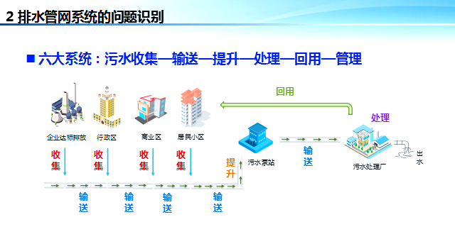 排水系统的“病症”体现在多个方面,主要集中在以下六大系统:污水收集、输送、提升、处理、回用以及管理。具体来说,就是以下六个方面的失衡: