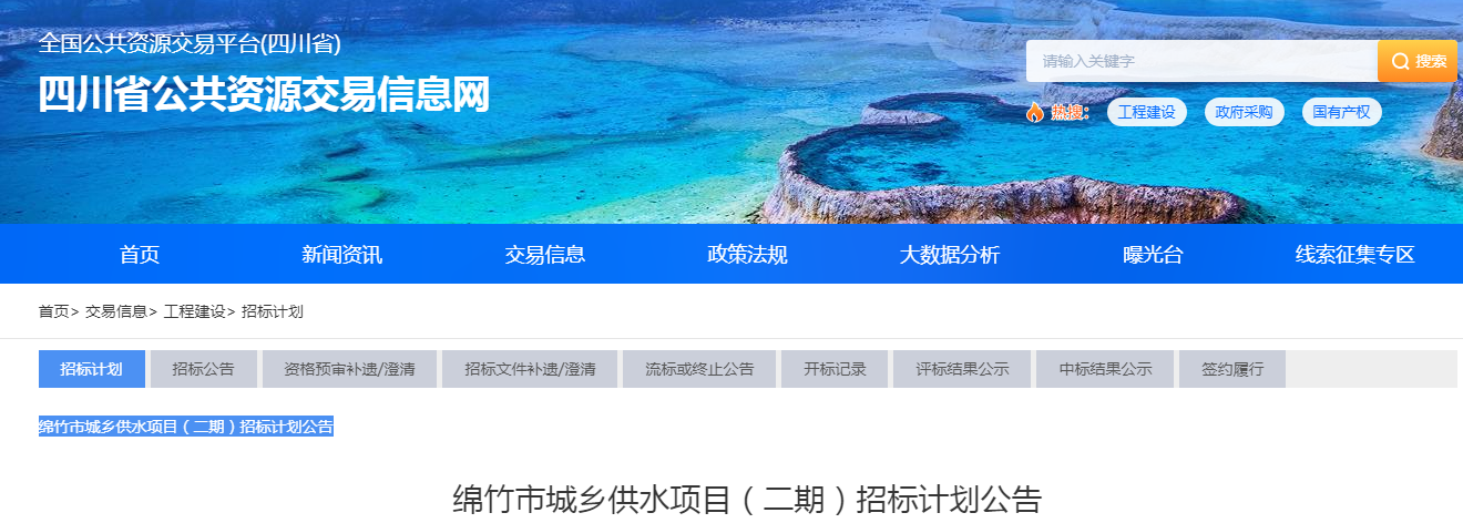 项目名称:绵竹市城乡供水项目(二期)招标计划