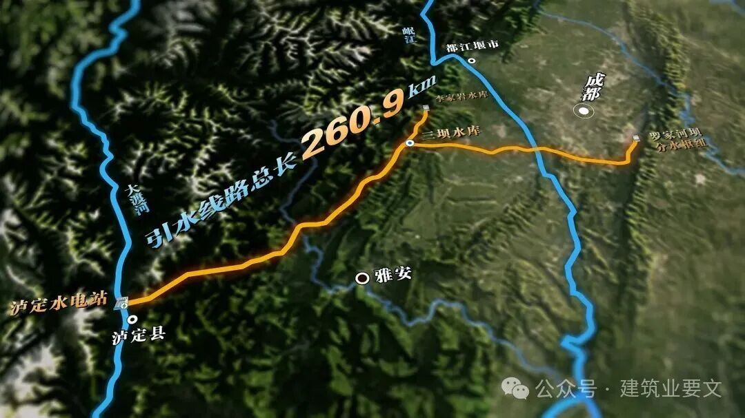 据悉,引大济岷工程从大渡河泸定水电站库区取水,蜿蜒穿越至成都平原,构建起“一总两干”的输水格局——总干线133千米,南干线103千米,北干线25千米,工程输水线路总长261千米,其中隧洞占比超58%(151千米),堪称“地下输水长城”