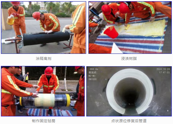 点状原位固化法:通过气囊将树脂织物压粘在破损处,适用于300—1200mm管道的局部渗漏修复。都园路污水泵站出水总管运用点状原位固化法应急抢修局部管道,修复时间快,渗漏处修复后状况良好。