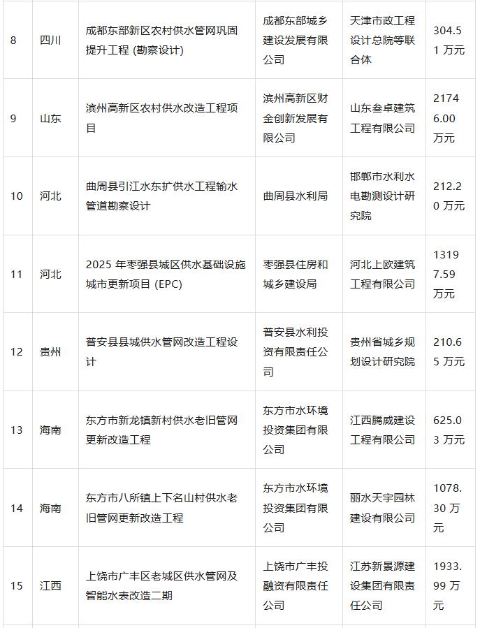 近期,全国供水管网改造及配套设施建设迎来集中落地期,一批重点民生供水工程相继完成招标定标。据统计,全国已有20 个重点供水管网项目正式确定中标单位,项目覆盖重庆、新疆、湖北、四川、山东、河北、贵州、海南、江西、安徽、黑龙江、甘肃、广东共 13 个省(市、自治区),中标总金额突破9.17 亿元