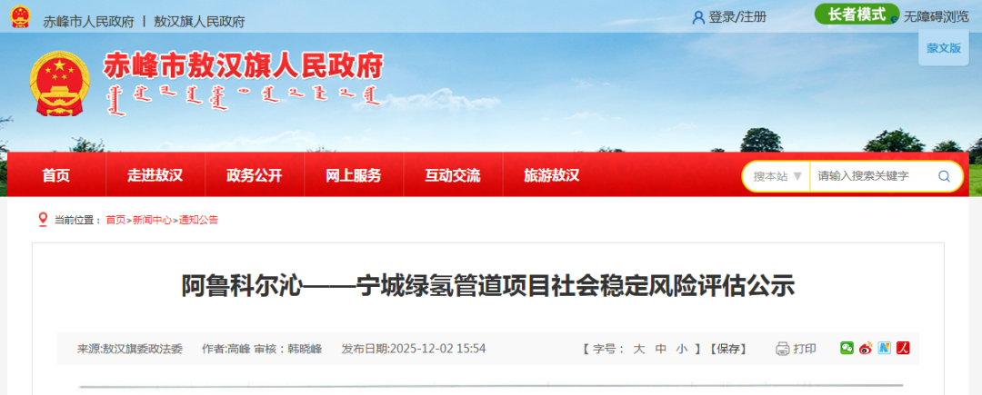 12月2日,赤峰市敖汉旗人民政府发布《阿鲁科尔沁——宁城绿氢管道项目社会稳定风险评估公示》。