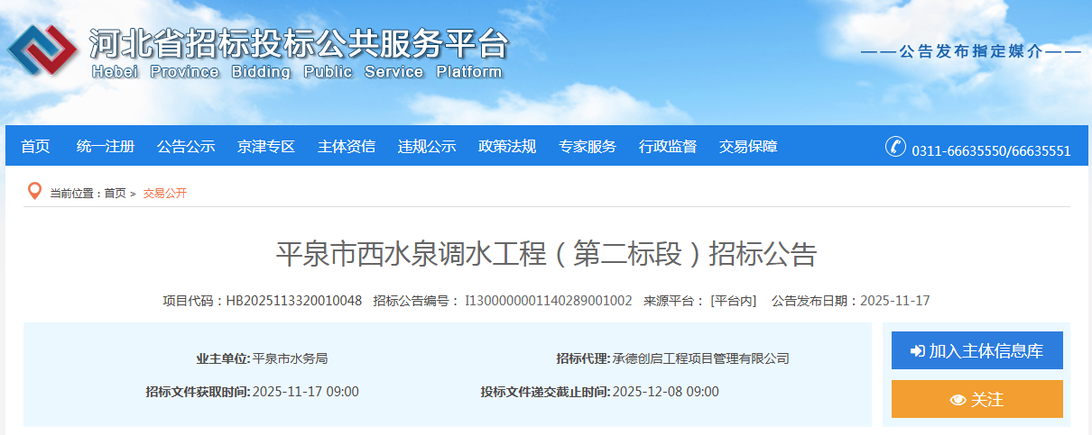 平泉市西水泉调水工程(第二标段)招标公告