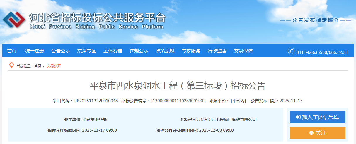 平泉市西水泉调水工程(第三标段)招标公告