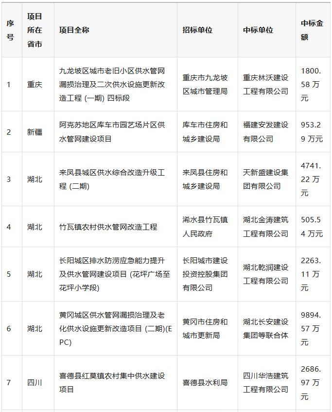 近期,全国供水管网改造及配套设施建设迎来集中落地期,一批重点民生供水工程相继完成招标定标。据统计,全国已有20 个重点供水管网项目正式确定中标单位,项目覆盖重庆、新疆、湖北、四川、山东、河北、贵州、海南、江西、安徽、黑龙江、甘肃、广东共 13 个省(市、自治区),中标总金额突破9.17 亿元