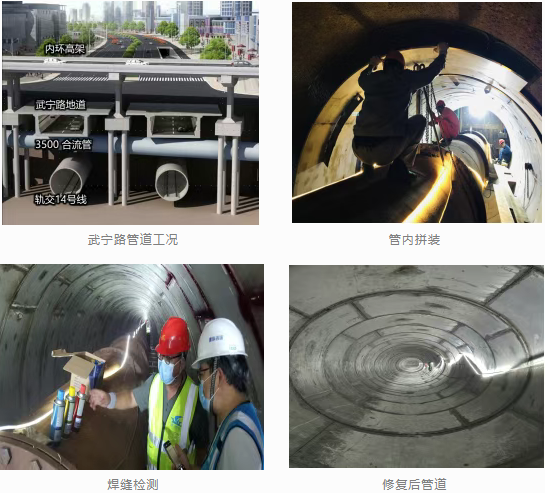 不锈钢管片内衬法:用不锈钢管片在管道内焊接成环,填充注浆后形成复合结构。此方法帮助武宁路DN3500合流管道解决地铁盾构周边排水管道抗沉降、抗振动的技术瓶颈,避免次生灾害。