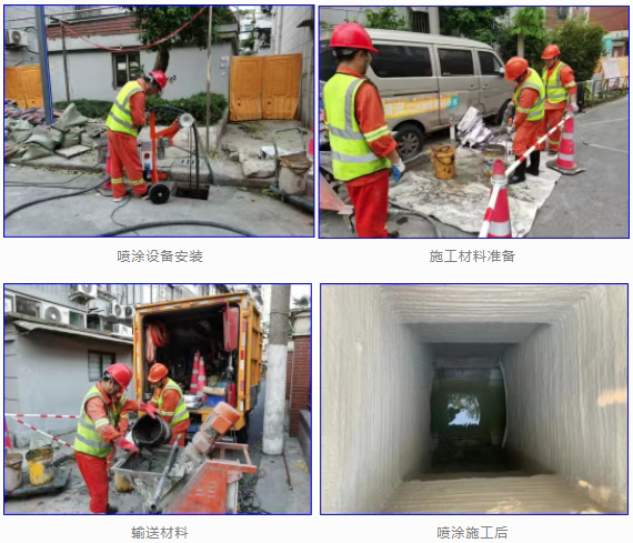 离心喷涂法:将配制好的特种防腐无机砂浆,泵送到位于检查井中轴的高速旋转喷头上,在离心力的作用下均匀甩向检查井内壁,在井壁上形成连续致密的内衬层。太浜巷检查井通过离心喷涂法开展修复,喷涂均匀、连续,修复后24小时即可投入使用,交付速度快。
